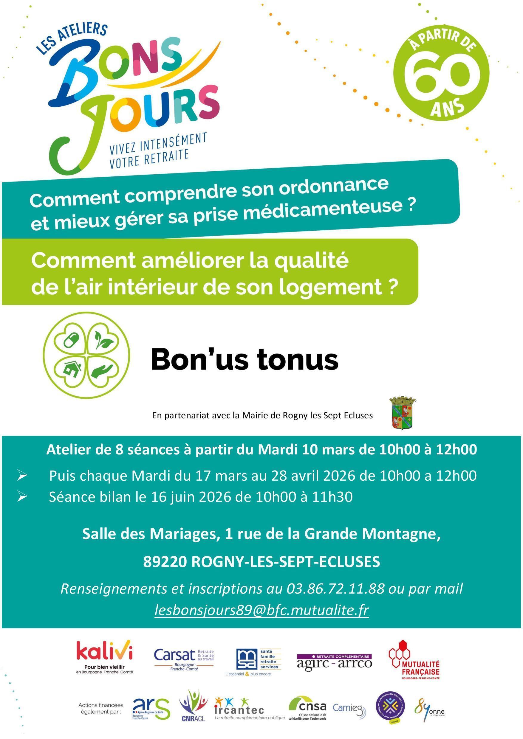 Inscriptions et renseignements auprès de Mathilde JAROSZ au 03 86 72 11 88 ou lesbonsjours89@bfc.mutualite.fr