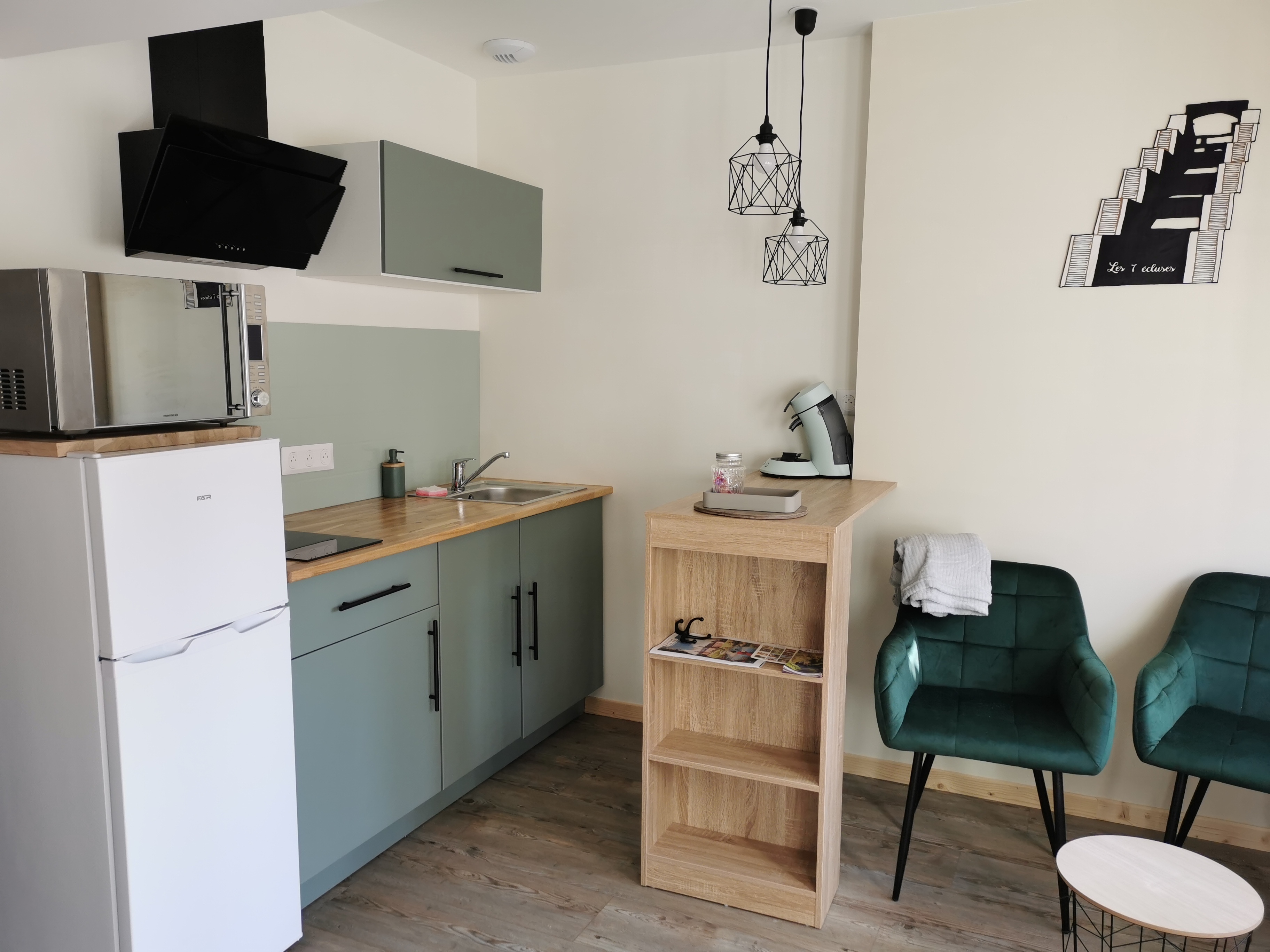 Cafetière Senseo, four combiné micro-onde, frigo, congélateur, bouilloire, accessoires de cuisine, ventilateur, TV écran plat, wifi, sèche-cheveux, draps et torchons fournis.