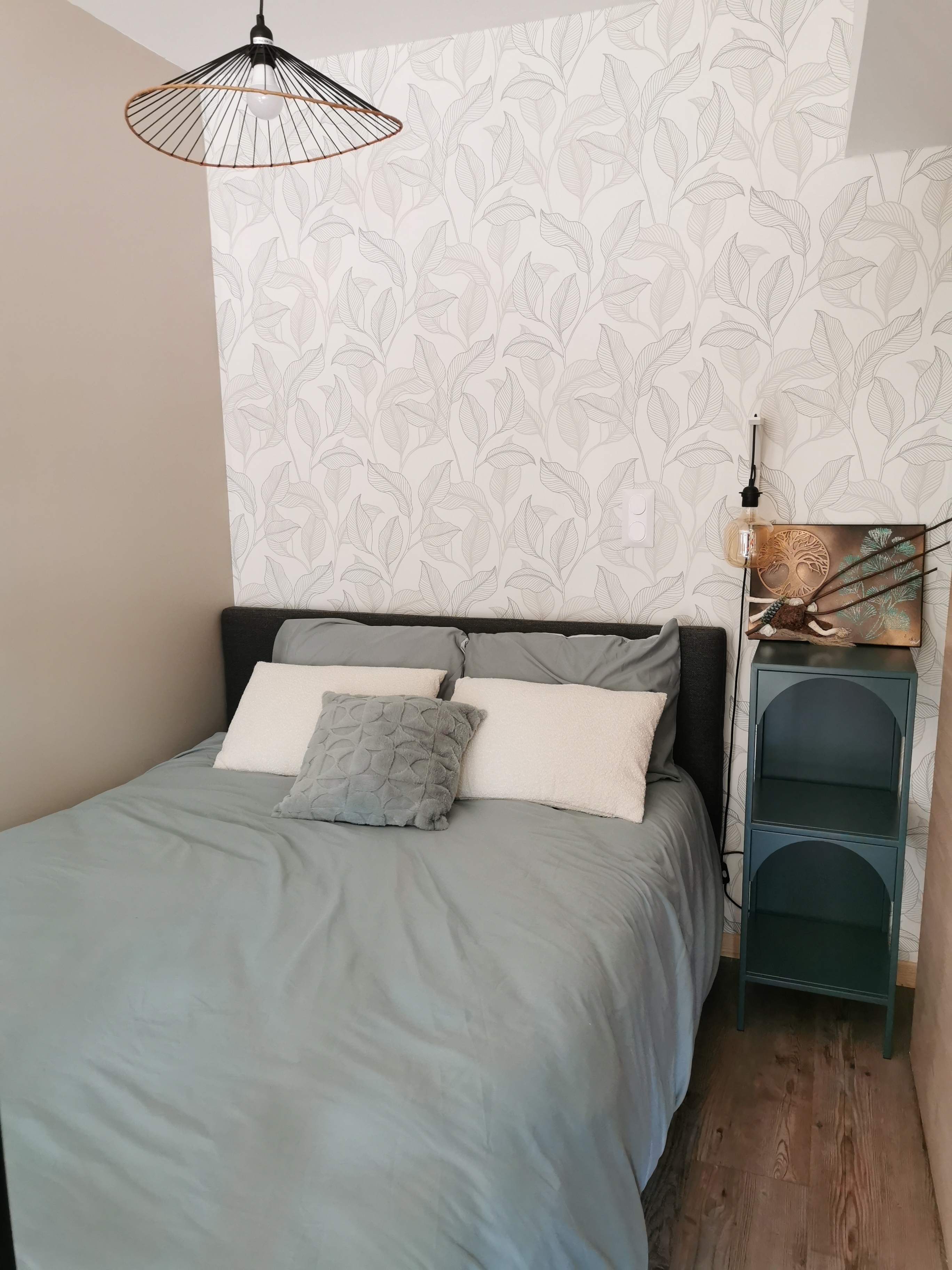Espace salon ouvrant sur espace chambre avec un lit en 140 cm.
